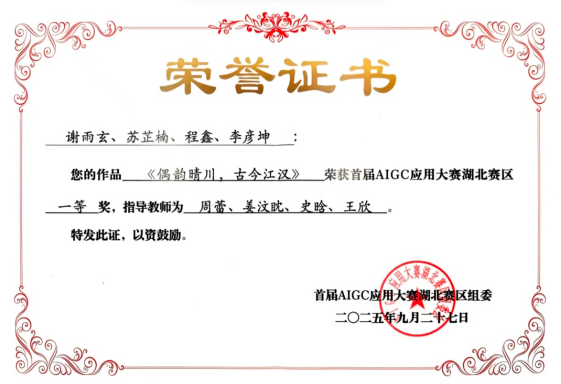 (通讯员 史晗)近日,第十届中国数据新闻大赛暨首届AIGC应用大赛评选结果揭晓。我校传媒艺术学院师生团队凭借AIGC视频作品《偶韵晴川,古今江汉》《你好南京:寻梦金陵》在激烈的竞争角逐中脱颖而出,荣获湖北赛区一等奖和二等奖的佳绩,《出发吧大学生》《疯狂动物城》也分别获得湖北赛区优秀奖,充分展现了我校团队在跨学科融合与创新实践教学上的显著成果。