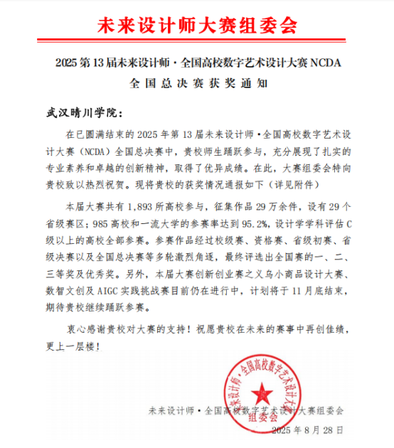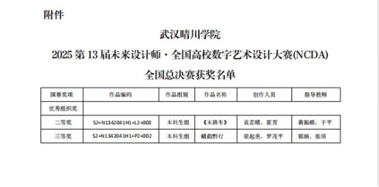 (通讯员 栗琦琦)近日,2025年第13届未来设计师·全国高校数字艺术设计大赛(NCDA)全国总决赛获奖名单正式揭晓,武汉晴川学院传媒艺术学院师生凭借卓越的才华与不懈的努力,再创辉煌战绩,荣获全国二等奖1项、三等奖1项,以及湖北省一等奖3项、二等奖6项、三等奖8项,总计斩获17项大奖。这一成绩不仅彰显了学院师生在数字艺术教育领域的深厚底蕴,更体现了师生携手共进、追求卓越的精神风貌。