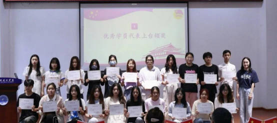 优秀学员代表汪静宜同学上台发言,分享了自己在团校培训中的收获与感悟,表达了将以此次培训为新起点,在今后的学习和工作中不断磨练自我、提升自我,勇担青年责任的坚定决心,发言真挚恳切,引发全体学员的强烈共鸣。颁奖环节将典礼气氛推向高潮。徐融老师、方雯怡老师为结业成员代表周雅慧、金灿、杜佳妮、刘宇峰、姜新月、王姬妮、徐淋俐、李明阳、陈施恩、沈炎颁发结业证书,见证学员们的成长硕果;党总支书记赵锐老师为优秀学员高梦洁、徐王镶、张蓝、康文鑫、董天浩、王奇烽、汪静宜、赵思颖、张良栋、董清朝颁奖,表彰他们在培训中的突出表现,激励全体学员以榜样为引领,砥砺前行。